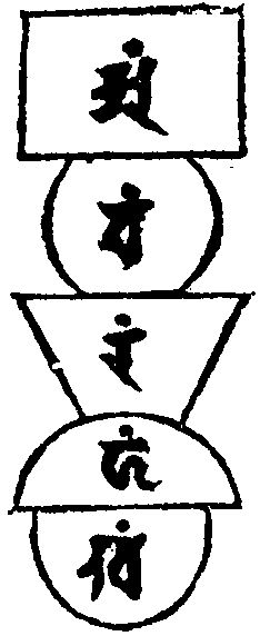 每字想時。口誦並歸命。心想本體字。其形如圖。阿字金剛輪黃色。次觀臍中◇[口*縛]字。為大悲水輪色如商佉或如乳色。形如滿月。如圖在下。[鍐-凶+(鬯-匕)]字水輪真言曰