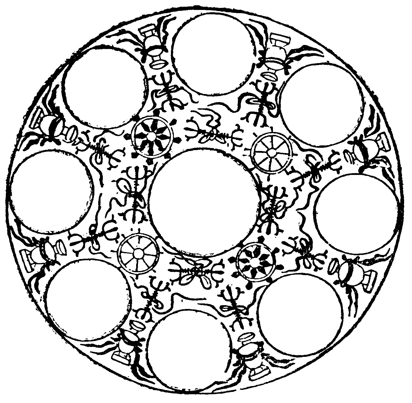 其大圓明內分為九圓。八寶瓶。十二金剛杵。四寶輪。從八寶瓶口豎八金剛杵。承四金剛輪。從輪四面橫拄四金剛。每瓶及金剛皆繼綵帶。靉靆垂布大圓明內。各坐九聖者。中心大毘盧遮那如來。頭戴五智寶冠。坐七師子座上。結跏趺坐結法界印。自餘諸尊。下曼荼羅品具明
